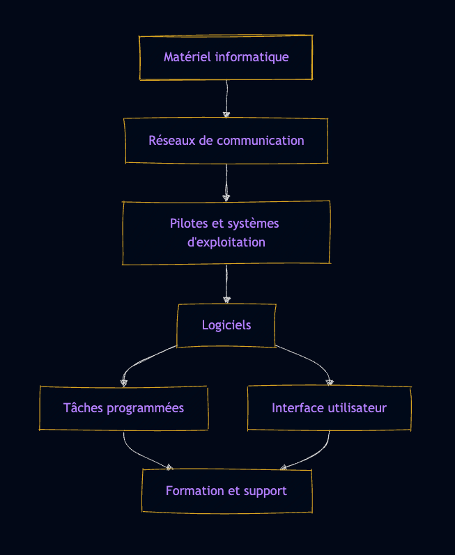 Elle débute avec le matériel informatique, suivi des réseaux de communication qui relient les équipements.