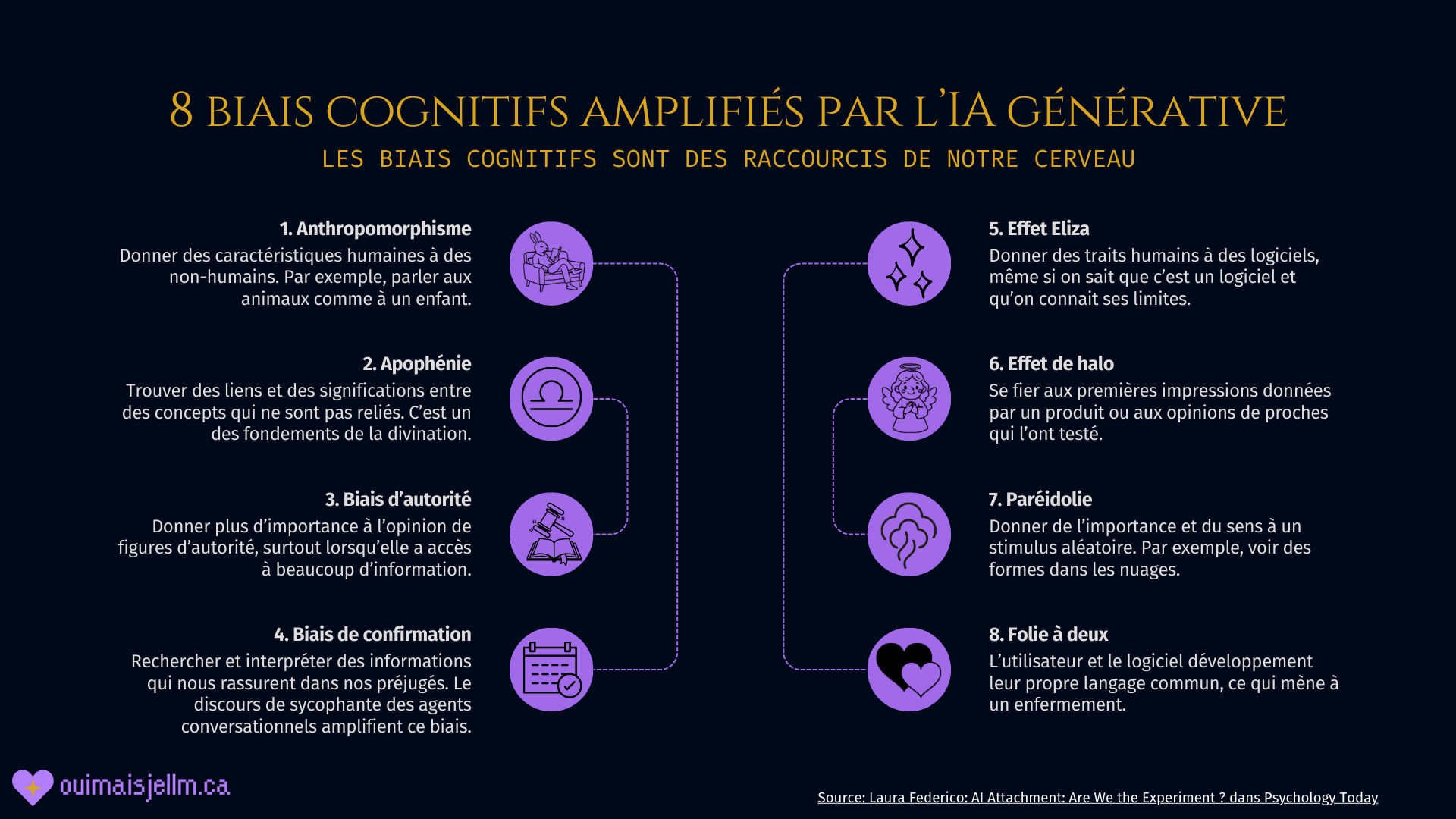 Je te présente en détail ces huit biais cognitifs qui sont particulièrement touchés par l'usage croissant des algorithmes d'IA générative.